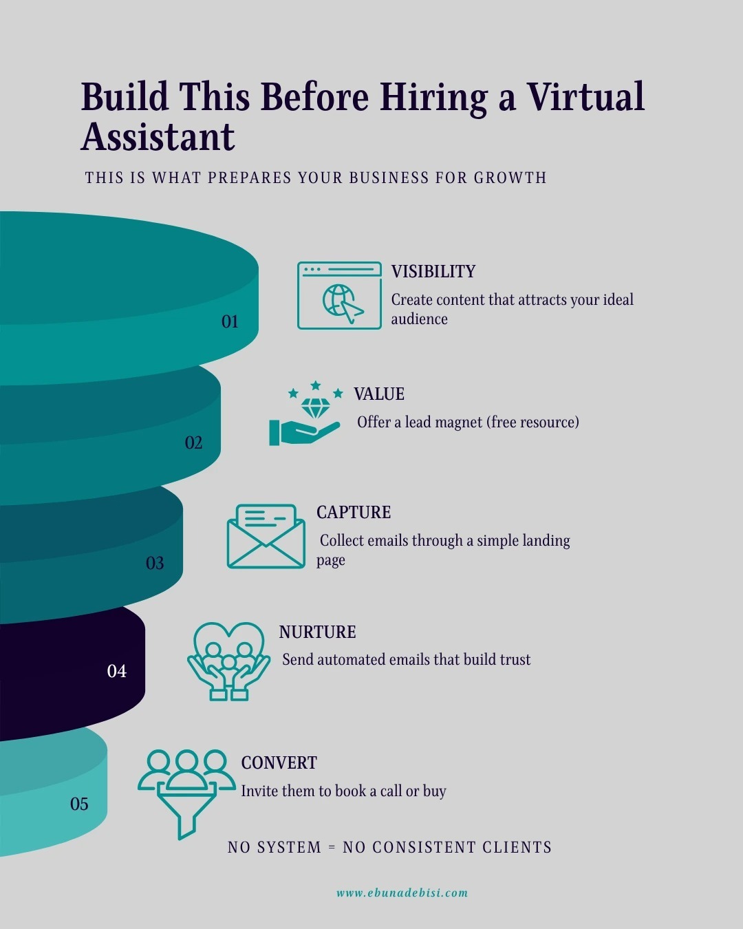A virtual assistant can support your growth, but they don’t create demand on their own. Getting clients depends on your visibility, offer, and systems. Once those are in place, a virtual assistant can help you manage and optimize the process.